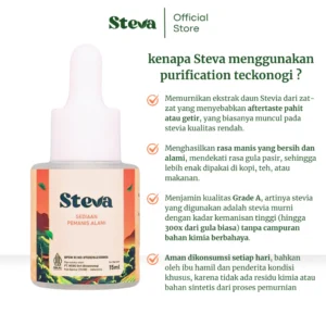STEVA adalah pemanis alami dari daun Stevia rebaudiana dengan Teknologi Purification yang menghasilkan stevia murni, tanpa aftertaste pahit & tanpa pemanis kimia tambahan!